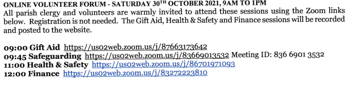 Zoom meetings covering gift aid, safeguarding, health and safety, and finance will all be held next Saturday morning.