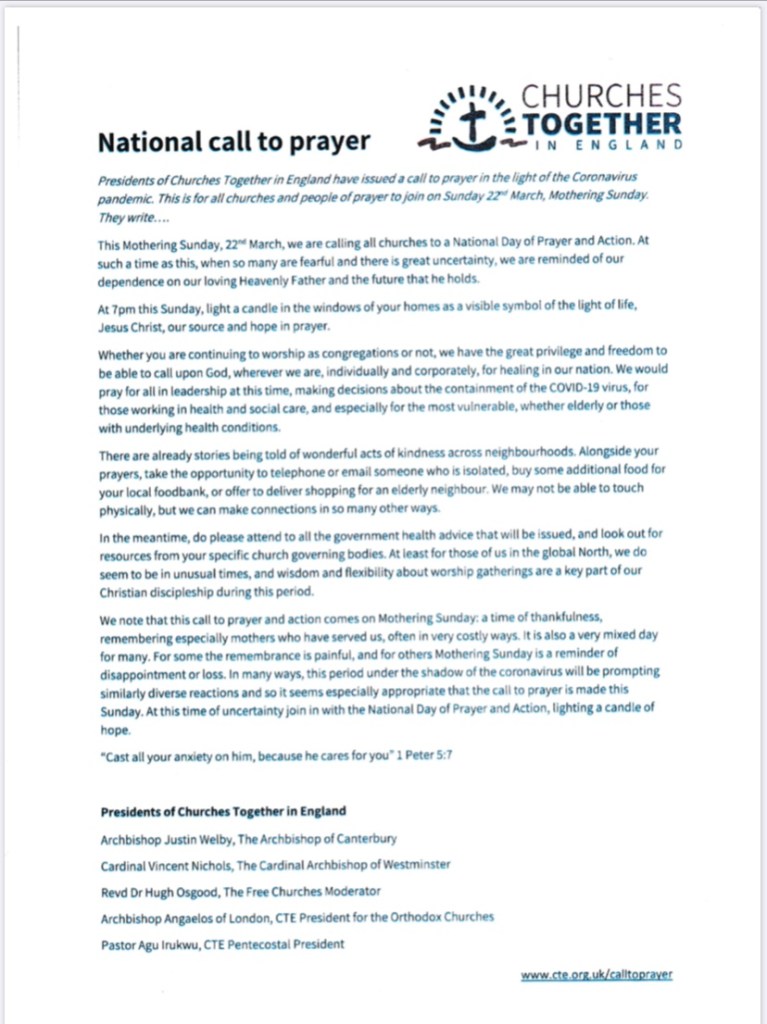To help us pray, this Sunday we have a message from Bishop Richard. This message can be found by following the following link – please click here. Once you have opened the page scroll down to find Bishop Richard’s message and press the ‘play’ button.